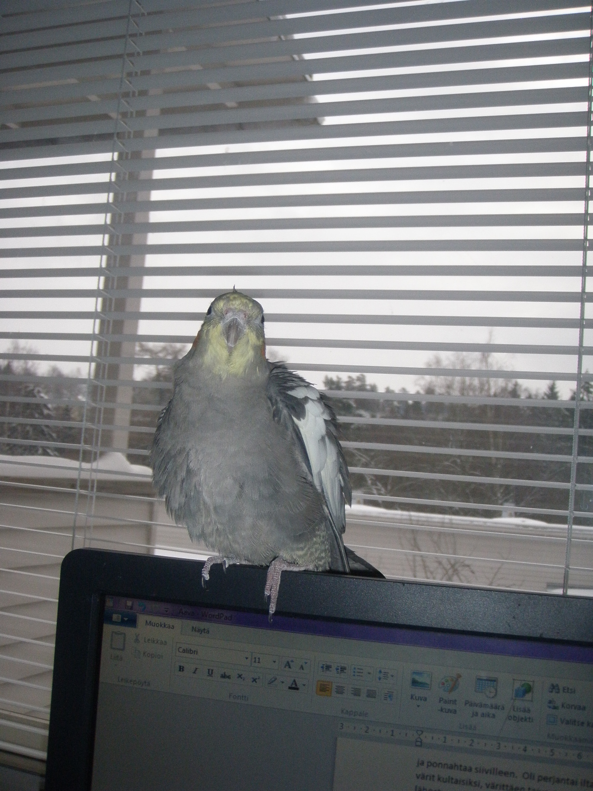 Linnut vapaana huoneessa, ekana saavat lentokohtauksen, eli lennetään huonetta ympyrää, kaikki koettaa laskeutua minihyllyn päälle ja onnistuu laseutumaan toistensa päälle, siitä tulee semmonen oravan pyörä, toinen laskeutuu toisen päälle, tiputta yhen joka kiertä huoneen ja laskeutuu sitten jonku toisen päälle. Sitten linnut löysivät gerbiileiden terran päällä olevan narun. Se naru on tuuletushöskästä roikkuva ja sen päässä oli, huom OLI, muovinen tappi. No linnut repi sen irti, aukasivat narun solmun ja jyrsivät sitä. Siitä oli sitten riitaa kuka saa leikkiä sen kanssa. Sillä riehuttiin hetki ja sitten leikittin karkkiaskin roskalla. Tässä vaiheessa Tom uskalsi tulla terraairion päälle muiden seuraan ja ihme ja kumma se söi hirssiä kun tarjosin. Välillä sillä on vaikeampia aikoja, jollon se ei voi edes lähestyä ihmisiä ollenkaan. Nyt se taas tuli syömään ihan rohkeasti 🙂 Sitten peseydyttiin ja suittiin ja Teralla meni taas hermo sen sulkiin?