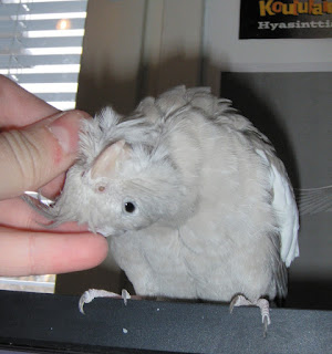 Anteeksi, olen pidätellyt tätä kirjoitusta, tähän asti, että Kaiho saapuu. Noh kuitenkin. Tämä päivä alkoi muutoin tavalliseen tapaan, mutta iltaan mennessä jännitys vain tiivistyy. Oli kello jo jokusen verran kunnes Sanna vihdoin soittaa, että ovat ihan pian perillä. Noudin heidät parkkikselta ja tuotiin Kaiho sisään. Sen häkkiin saamisessa ei kovin kauaa kestänyt. Ensin pienokainen meni levähtämään pitkän automatkan jälkeen. Ei kyllä kauaa kestänyt, kun se oli jo rennompi, suki itteään ja etsi juomapaikan. Vettä joi ja ruokaakin söi antaumuksella. Se oppi “navigoimaan” häkissä nopeasti ja otti kontaktia lintuihin. Tom tietysti heti ignoorasi ja sähisi, niinkuin se tekee kaikille. Dexistä se kiinnostui erityisen paljon ja seuraa tätä ympäri häkkiä nyt. Idan kanssa mietittiin sopisko sitten Dex sille, mutta sen piiloväreistä ei oo ihan varmuutta, joten en taida ottaa riskiä ja en viittisi pilata koko suunnitelmaa. Ehkä vain etsin sen valkkariherran tuolle tytölle.