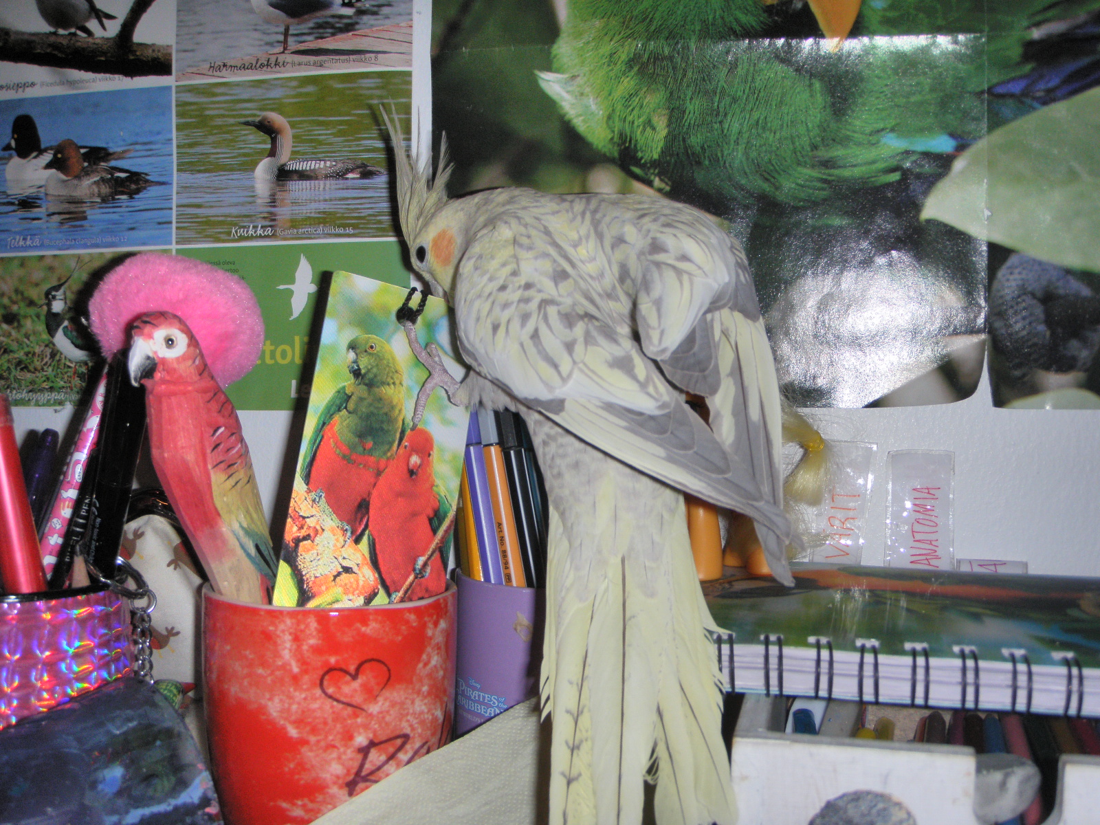 Tuntuu niin oudolta taas kun on vain 4 lintua. Yleensä lasken pari kertaa päivässä että niitä on nyt 5. On niin hassua…Myös vähän outoa kun ei aina tarvitse säikähtää kuka tuolin nojalla istuu, koska useimmiten se on aina Tom joka siellä kököttää. Nyt muut ovat vain siellä missä yleensä. Eipähän tarvitse pelätä etten nojaa enään sen päälle. Linnut on myös vähän ihmeissään, parvi on vähän tavallista hiljaisempi nyt. Kaikki on vähän järkyttynyt. Mutta eiköhän se siitä vielä. Seuraava lintu joka tulee on siis Quinn, ja en aio tehdä sitä virhettä että tungen heti kaikkien sekaan, koska lyön vaikka vetoa, että se ihastuu ihan keneen tahansa muuhun kuin Teraan… Laitan ne asumaan kahdestaan toiseen häkkiin ainakin sen viikon ajaksi minkä sen pitää olla häkissä muutenkin. Hironkin kuulumisia voisi kysellä vähän ja siitä pesityksestä ja muusta ja sen semmoista.